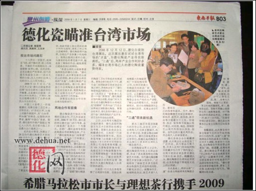 2008年12月12日,德化白瓷到臺灣展出。這次展出意在試試臺灣市場的“水溫”,為德化陶瓷產(chǎn)業(yè)尋找新商機。“三通”后,兩岸產(chǎn)業(yè)合作利好多多,瞄準(zhǔn)臺灣市場已久的德化陶瓷蓄勢待發(fā)。
