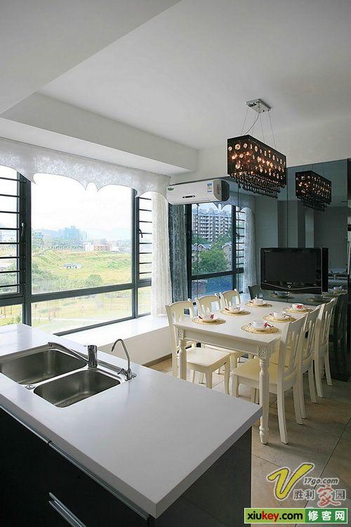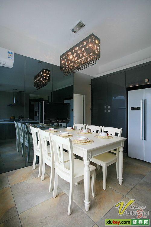 首先,在空間處理上打破常規(guī),令廚房、餐廳、客廳三者之間形成了一個(gè)有趣的空間關(guān)系,讓純凈的世界不顯單調(diào)。具體做法是把原來餐廳的位置和靠廚房這邊臥室 的位置做了對(duì)調(diào),餐廳從客廳中獨(dú)立開來并與廚房構(gòu)成一個(gè)大的空間,這也正好是符合中國人的習(xí)慣,同時(shí)又利用原有承重墻充當(dāng)了與客廳之間的屏障作用,使得客 廳也有了其完整性。餐廳廚房以清雅的冷灰色調(diào)為主,以簡、意、雅的感受滲透整個(gè)空間的每個(gè)細(xì)節(jié)中,整體造型上采用非常簡潔的直線條勾畫,背景墻面特意設(shè)計(jì) 成鏡面,打破了原本整塊墻面的沉悶,使整個(gè)空間顯得靈動(dòng)時(shí)尚。
