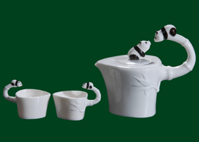 據(jù)德化陶瓷工藝師介紹,“團(tuán)團(tuán)圓圓”瓷壺為心形造型,高15厘米、寬18厘米;瓷壺蓋上雕有一頭黑白相間的熊貓,壺的把手為竹節(jié)形狀,頂端雕有一頭黑白相間的熊貓與壺蓋熊貓相對應(yīng),象征“團(tuán)團(tuán)圓圓、長相廝守”。壺外配上兩只心形小茶杯,把手上也各雕有一頭憨態(tài)可掬的熊貓,與茶壺相呼應(yīng),表達(dá)了兩岸人民共盼闔家團(tuán)圓的美好愿望。