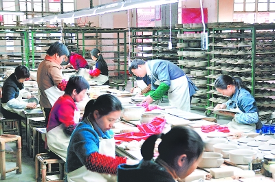 在國際金融危機(jī)影響下,德化縣三班鎮(zhèn)陶瓷產(chǎn)業(yè)依靠穩(wěn)住生產(chǎn)、產(chǎn)業(yè)升級、延伸產(chǎn)業(yè)鏈,進(jìn)一步壯大實(shí)力。近兩個月來,宏順陶瓷有限公司接到30萬美元訂單,目前已吸納其他陶瓷產(chǎn)區(qū)180多名熟練技術(shù)工人。圖為宏順生產(chǎn)車間一角。 劉益清 陳尹荔 黃鵬輝 攝