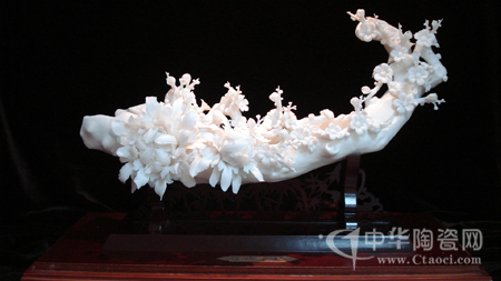 《梅竹爭艷》是周秀燕的嘔心瀝血之作,長33cm,寬21cm,高37cm,經(jīng)過1300多度燒制而成。周秀燕主要采用了梅、竹這兩個(gè)題材,通過德化特有的“白如雪、潤如玉、透如絹”的優(yōu)質(zhì)瓷泥,塑造出了栩栩如生、人見人愛的瓷花。