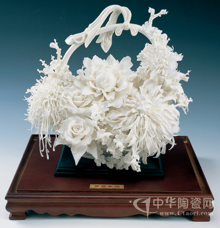 作品采用德化特有的“白如雪、潤如玉、透如絹”的優(yōu)質瓷泥,以花籃為載體,以牡丹、菊花、玫瑰為題材,表達了人們對美好生活的追求。牡丹、菊花等都是富貴吉祥的象征,是中華民族傳統(tǒng)文化的情結,周秀燕在傳統(tǒng)的技術基礎上結合這一傳統(tǒng)意蘊,滿載一籃星輝,幸福滿溢。(蘇曉霞)