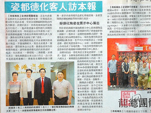 涂健圻說,德化縣政府此次率企業(yè)團(tuán)到香港推介陶瓷,不僅規(guī)模較大,而且名家最多,層次較高,還有很多出口企業(yè),抵港后看到各屆媒體的報道,證明香港商報先前的安排很好。他說,來到香港,一靠鄉(xiāng)親,二靠媒體。涂健圻表示,德化的陶瓷主要以出口為主,出口許多是經(jīng)過香港轉(zhuǎn)口,香港具有獨(dú)特的窗口優(yōu)勢,希望香港商報為瓷都化牽線搭橋,并希望陳錫添總編輯能帶隊(duì)到德化采訪。