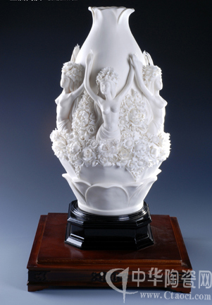 《共創(chuàng)和諧》寬32cm,高56cm,以德化“白如雪、潤如玉、透如絹”的優(yōu)質(zhì)瓷泥為胎質(zhì),經(jīng)過1360℃煅燒而成。整件作品造型和諧,潔白細(xì)膩,精雕細(xì)刻,用蓮花做主體,代表著心連心,一方有難,八方支援,共渡難關(guān),共創(chuàng)美好的明天;五位美少女代表五大洲,五位少女的手拉手環(huán)繞花瓶,猶如五洲手拉手環(huán)繞全球,不只是人與人要和諧,國與國也要和諧相處,共創(chuàng)輝煌。作品昭示著五洲同心同德,共創(chuàng)繁榮、和諧社會。法國詩人保爾?福爾曾寫過“假如全世界的少女都肯攜起手來,她們可以在大海周圍跳一個回旋舞”!豆矂(chuàng)和諧》傳遞出了我們共同的心聲——“傳遞愛心,和諧社會”。作品在牡丹、百合等繁花的簇?fù)硐逻M(jìn)一步體現(xiàn)了共創(chuàng)繁榮社會的內(nèi)涵。此件作品在2008年8月被英國珍品博物館收藏。(蘇曉霞)