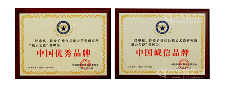 每一個(gè)人都是自身的品牌,一家企業(yè)也一樣,品牌就是影響力。經(jīng)過多年來的生產(chǎn)、經(jīng)營,戴云藝瓷研究所一直獲得好評(píng),唱響國際。2009年1月,中國品牌發(fā)展組織委員會(huì)經(jīng)審核,特授予德化縣戴云藝瓷研究所“戴云藝瓷”品牌為“中國優(yōu)秀品牌、中國誠信品牌”。這不僅是對(duì)戴云藝瓷的高度評(píng)價(jià),而且在金融危機(jī)品牌意識(shí)提升之際,此榮譽(yù)進(jìn)一步提高了戴云藝瓷的競爭能力。
