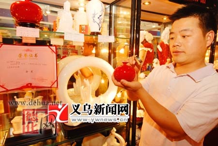 在2009中國(guó)義烏文化產(chǎn)品交易博覽會(huì)工藝美術(shù)作品評(píng)選中,德化陶瓷選送的《和諧》、《春風(fēng)得意馬蹄疾》、《雞毛換糖》、《貴妃醉酒》等4件白瓷工藝美術(shù)作品,分別獲得金獎(jiǎng)、銀獎(jiǎng)和銅獎(jiǎng)。德化陶瓷精品館總經(jīng)理陳濟(jì)金說,我們以此次獲獎(jiǎng)為動(dòng)力,努力開發(fā)陶瓷工藝新產(chǎn)品,為義烏市場(chǎng)繁榮多作貢獻(xiàn)。圖為陳濟(jì)金在逐件檢查上柜精品陶瓷。