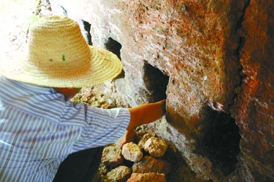 貓身鉆進(jìn)窯洞,首先感到一陣清涼。窯洞呈半橢圓形,長約6米,寬約3米,最高處約6米,是用一塊塊巨大的青磚壘成,呈螺旋狀,非常有特色。窯前分布著15個(gè)通火孔,四周是一層厚厚的窯漢,堅(jiān)硬異常。