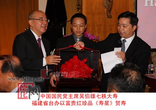 伯公在海峽兩岸和平發(fā)展上做出的杰出貢獻(xiàn),有目共睹。為此,福建省臺(tái)辦當(dāng)天也派專人攜貴禮前往祝壽,禮品《壽星》由中國瓷都·德化的富貴紅公司所制。
