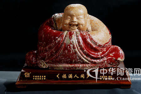 《福滿人間》是戴云藝瓷窯變工藝的代表作品,是一件還原數(shù)百年前的銅紅釉瓷彌勒佛像,是先用廢棄瓷砂土雕制成型,再在衣飾上施上銅紅釉,再經(jīng)過1310℃—1330℃還原焰高溫窯變燒制而成。所謂窯變是指器物在窯內(nèi)燒制時,由于窯中含有多種呈色元素,經(jīng)氧化或還原,出窯后會呈現(xiàn)意想不到的釉色效果。禪語曰:“求美則不得美,不求美則美矣”。窯變的不可捉摸性注定了燒制成的單品價值連城。它的燒制成功,填補了陶瓷界利用廢棄瓷砂土燒制銅紅釉瓷器的空白,豐富了德化陶瓷工藝的內(nèi)涵。這尊彌勒佛慈眉善目、笑顏永駐,生動傳神地表現(xiàn)出他的降生就是為人間帶來福氣、好運。