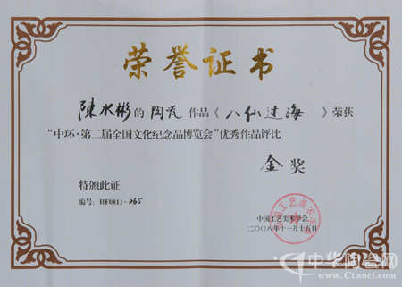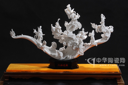 陳水彬以德化溫潤如玉的“中國白”為載體,演繹出了形神兼?zhèn)涞?ldquo;八仙過海”。作品潔白細膩而又堅實厚重,長90 cm,寬25cm,高62cm,燒制難度極高,收成率低。作品造型和諧,層次分明,八位神仙各就其位,各持法寶,各顯神通。大大的海浪采用夸張的手法,顯示出海浪的波濤洶涌,動感力度極強。感人的作品都源于生活,陳水彬的海浪也是受大自然魅力的感染,又深得福建省工藝美術大師楊劍民的真?zhèn)鳎瑢⒑@说捏@濤駭浪雕刻得栩栩如生,表現出高超的雕刻技藝。作品將傳統的歷史題材賦予時代的精神,展示出了在這國際金融危機的驚濤駭浪中攜手同進,展示了在這競技的時代各展才能。(蘇曉霞)