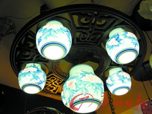 大南路的泰古燈飾城,是廣州較早的燈飾市場,價(jià)格也比較平民化。在二樓,記者看到一種非常漂亮的瓷藝燈,它采用一種薄胎瓷代替玻璃制成燈罩,在燈罩上面繪上山水、花草、人物等圖案,再配上精致的木制燈座,將古樸的瓷器巧妙地融入現(xiàn)代生活中。