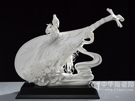 比如《和諧共鳴》,她是以德化優(yōu)質(zhì)瓷泥為載體,演繹出了和諧之聲。一位美麗的飛天女與古典樂(lè)器琵琶緊緊融合在一起,飛天女吹著笛子,笛聲悠揚(yáng)飄蕩,與琵琶聲產(chǎn)生共振、共鳴,奏出了和諧之聲,昭示著渴望世界、社會(huì)的和諧,家庭的和諧。