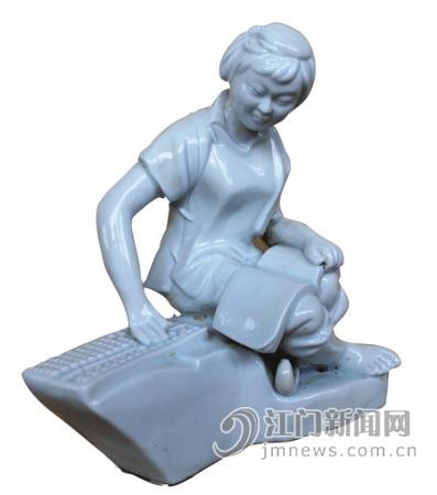 此尊德化瓷塑取名“日進(jìn)斗金”,通高17.5厘米,背面有“德化陶瓷廠出品”字樣,為福建德化陶瓷塑廠的“文革”外銷瓷。古代吉語有“日利千萬”一詞,后被藝術(shù)家所用,改為“日進(jìn)斗金”。早期或繪畫或雕塑,人物造型以帳房先生為多,民國以后逐漸改為少女形象,而此尊塑像又多了“文革”的特有印記,故十分珍貴。(江門日?qǐng)?bào) 第7237期 A15版)
