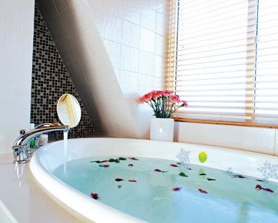 圖解:二:半開(kāi)放式風(fēng)情浴室 巧妙利用百葉、珠簾等軟隔斷將空間進(jìn)行一次分隔,開(kāi)“開(kāi)放”的基調(diào)上制造“私密”,給自己一個(gè)靈活的選擇。 1、格局要素:衛(wèi)浴間矮墻隔斷巧妙分隔空間。 2、材質(zhì)要素:亮片珠簾為衛(wèi)浴間營(yíng)造嫵媚浪漫。 3、器物要素:衛(wèi)浴間外的洗手池使用很方便。