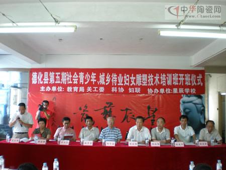 7月31號(hào),德化縣第五期社會(huì)青少年、待業(yè)婦女雕塑技術(shù)培訓(xùn)班開(kāi)班式在星辰學(xué)校舉行。市關(guān)工委常務(wù)副主任鄭今奮,市慈善總會(huì)副會(huì)長(zhǎng)陳伯禹,市科協(xié)副主席林丕鼎、市農(nóng)函大常務(wù)副校長(zhǎng)陳建平,縣關(guān)工委、教育局、婦聯(lián)、科協(xié)領(lǐng)導(dǎo)同志,星辰雕塑職業(yè)培訓(xùn)學(xué)校負(fù)責(zé)人、老師和本期雕塑技術(shù)培訓(xùn)學(xué)員出席開(kāi)班儀式。