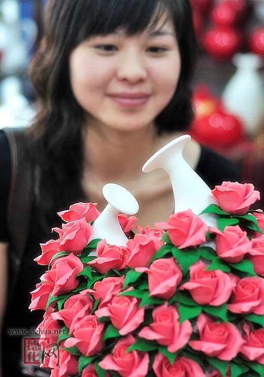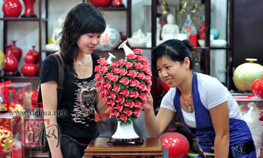 23日,德化縣一家陶瓷店內(nèi)年輕女孩在觀賞陶瓷玫瑰花。隨著中國傳統(tǒng)情人節(jié)“七夕”臨近,德化陶瓷店生意日漸紅火,許多顧客紛紛預定“七夕”的陶瓷玫瑰系列產(chǎn)品,“永不凋謝的玫瑰”開始走俏。