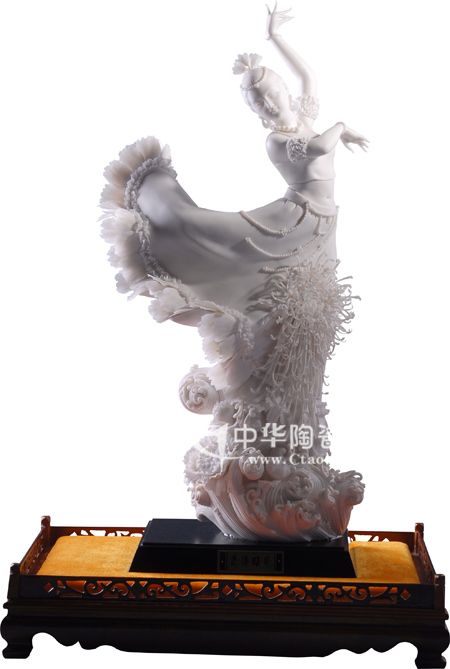 《雀之靈》通過(guò)建白瓷淋漓盡致地表現(xiàn)了富含云南民族傳統(tǒng)文化的傣族舞姿,融兩地特色為一體,充分表達(dá)了對(duì)云南、福建兩地共同繁榮發(fā)展的祝福!作品造型豐滿、和諧,通過(guò)手指、腕、臂、胸、腰、髖等關(guān)節(jié)的一波三折,惟妙惟肖展示出了優(yōu)美的舞姿,柔若無(wú)骨又寸寸是節(jié)。一雙水靈靈的眼睛,俊俏高挺的鼻梁,微合的櫻桃小嘴,嘴角自然地微微上揚(yáng),柔美的線條勾畫(huà)出一副恬靜而安詳?shù)哪橗。她的陶醉、沉迷像是在與上蒼對(duì)話,俯仰天地,與自然的靈氣融為一體,超強(qiáng)磁性的文化藝術(shù)凈化了塵世的心靈,“只可遠(yuǎn)觀而不可褻玩焉”。