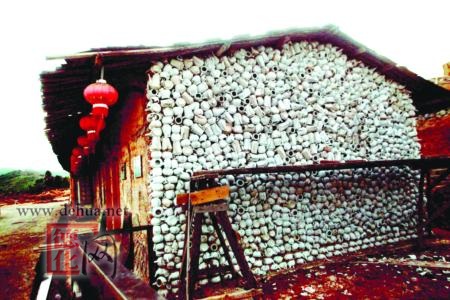 從窯場(chǎng)出來,忽然看到邊上一座特別的房子,整堵墻都是用各種樣式、大小不等的茶壺壘成。原來,幾個(gè)月前,十幾名外國(guó)人來到古窯旁邊,他們把附近窯口燒壞的次品茶壺?fù)斐鰜,搭成了?米多的白色茶壺墻壁。