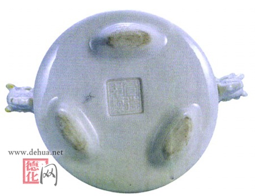 這尊魚龍雕塑香爐,直徑12厘米,高6厘米,呈玉白釉色,細膩滋潤,兩邊對稱的魚龍雕塑,緊緊地貼著爐身,魚龍棱角分明,鱗片清晰,造型優(yōu)雅,生動活潑。爐腰身微微收束,成弧形,腰間有條回紋圖案點綴器物,多了靈氣,更顯古樸大方。爐里外包括爐底,均勻地施著玉白色釉,三足鼎立,僅足底露出點胎體,可見瓷土淘洗干凈,胎骨緊密,爐全身為細開片,錯落有致。爐底有一篆書寄年款“宣德年制”,字體端莊整齊,此乃罕見之器物。在眾多的漳州窯里,很難找到帶寄年款的珍貴器物,應是明晚期的產(chǎn)品。