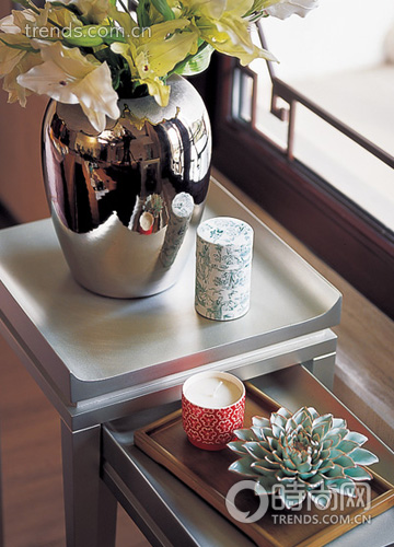 淺色的中式邊幾搭配金屬鏡面花瓶,體現(xiàn)出一種低調(diào)的生活態(tài)度,落落大方的百合讓窗景成為一幅生動的畫作。