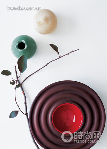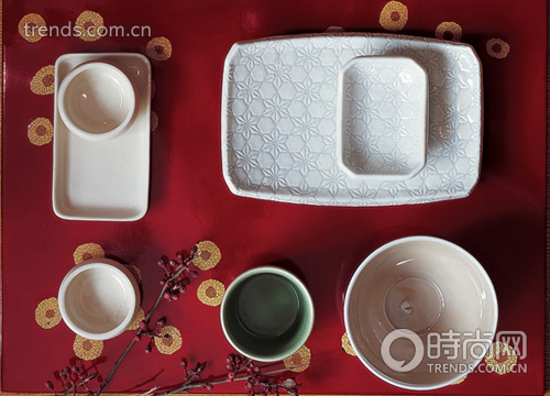 成組的中式的陶瓷餐具更符合現(xiàn)代人的使用習(xí)慣。散落的碎花點綴在紅色的漆盤中,東方韻味躍然于餐桌上。