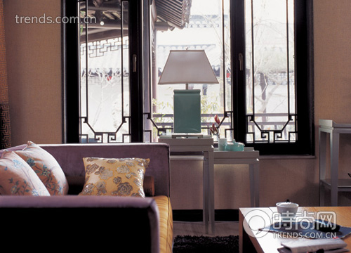直線的窗與邊幾保持著中式一貫的基調(diào)?堪系幕ǘ鋱D案搭配新古典茶幾,傳達(dá)出現(xiàn)代與古典的精致。