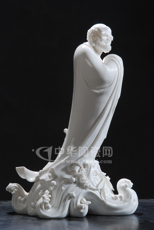 作品《一葦渡江》瓷質(zhì)堅實(shí)厚重,瑩潤潔白,腳踏一葉蘆葦,昂首屹立于浪尖上,給人一種空靈、超脫的心境。兩只突鼓的眼睛炯炯有神,滿臉絡(luò)腮胡子,卷曲盤旋,身材魁梧,形象端莊,儀態(tài)非凡。