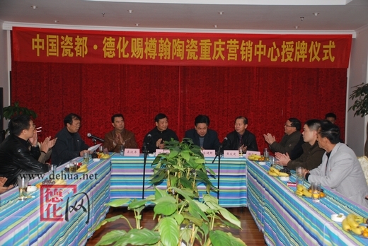 縣委常委、宣傳部長、教育工委書記、中國瓷都德化品牌宣傳工作領(lǐng)導(dǎo)小組常務(wù)副組長涂健圻,縣政府副調(diào)研員、中國瓷都德化品牌宣傳工作領(lǐng)導(dǎo)小組副組長黃發(fā)建,重慶市工藝美術(shù)協(xié)會副會長何發(fā)美,武漢市江岸區(qū)總工會主席呂和平,成都市工藝美術(shù)公司董事長洪星等三城市的有關(guān)部門負(fù)責(zé)人、社會各界人士以及中國新聞社重慶分社、重慶晚報、湖北電視臺、武漢教育電視臺、長江商報、四川電視臺、成都電視臺、四川日報等三地的主要媒體記者分別出席這三個營銷中心的授牌宣傳活動, 涂建圻為三地的營銷中心授牌,黃發(fā)建在三地營銷中心授牌儀式上致辭。