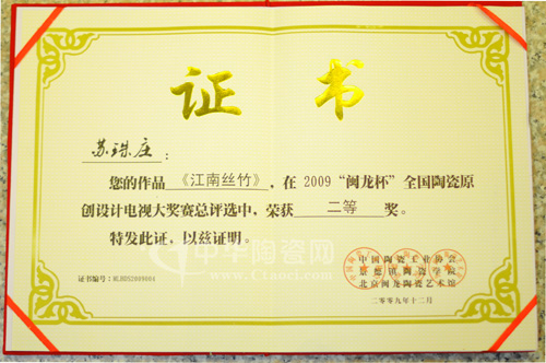 2009年11月24日,2009“閩龍杯”全國陶瓷原創(chuàng)設(shè)計大獎賽在人民大會堂頒獎,德化蘊玉瓷莊第四代傳人蘇珠莊所創(chuàng)作的《江南絲竹》在2570件中脫穎而出,榮獲二等獎。