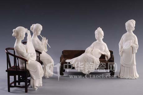 《江南絲竹》以德化特有的“中國白”為原料,潔白透亮、如脂似玉,淋漓盡致地表現(xiàn)出了江南女子的溫柔、秀美,極具欣賞價值。作品中四個江南女子或坐、或立、或躺,或持扇、或彈琵琶、或吹笛子,讓人感覺像小橋流水,亦像是一曲婉約的小曲,讓人產(chǎn)生很多的遐想:人在白墻灰瓦的大院里面,聽著音樂,悠閑自在,表現(xiàn)人生活狀態(tài)的一種場景。