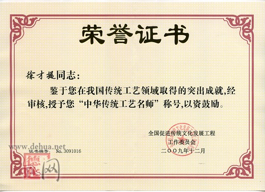 憑借精湛的陶瓷創(chuàng)作技術(shù)以及非凡的創(chuàng)意理念,徐才提大師在我國傳統(tǒng)工藝領(lǐng)域取得了突出成就。2009年12月,全國促進(jìn)傳統(tǒng)文化發(fā)展工程工作委員會授予徐才提大師“中華傳統(tǒng)工藝名師”的名譽稱號,對其在我國傳統(tǒng)工藝領(lǐng)域做出的貢獻(xiàn)給予了肯定。