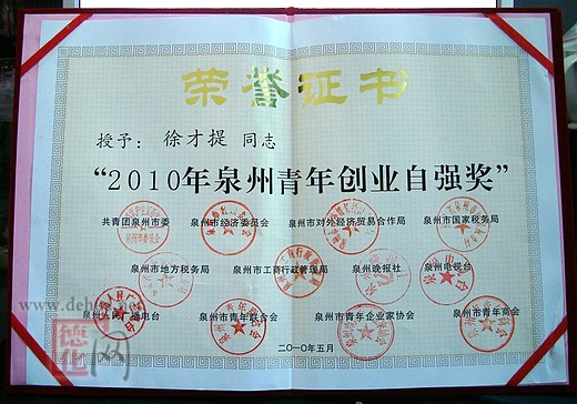 在由團市委、市經(jīng)委、市外經(jīng)貿(mào)局、市國稅局、市地稅局、市工商局、泉州晚報社、泉州電視臺、泉州人民廣播電臺、市青聯(lián)、市青企協(xié)、市青商會聯(lián)合開展“2010年泉州青年創(chuàng)業(yè)獎”評選活動中,德化縣徐才提榮獲“2010年泉州青年創(chuàng)業(yè)自強獎”。