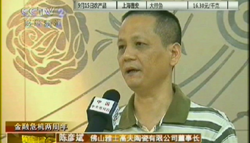 在央視拍攝節(jié)目現(xiàn)場(chǎng),董事長(zhǎng)陳彥斌就“現(xiàn)代磚發(fā)起創(chuàng)新革命”、“低碳時(shí)代,陶瓷業(yè)如何發(fā)現(xiàn)市場(chǎng)新空間”以及“現(xiàn)代磚走向藝術(shù)化策略創(chuàng)新發(fā)展”等問題,發(fā)表了許多深刻獨(dú)到的見解。他指出,金融危機(jī)風(fēng)暴是危機(jī)也是商機(jī),雅士高夫在國(guó)家優(yōu)化產(chǎn)業(yè)結(jié)構(gòu)之際,從產(chǎn)品研發(fā)、生產(chǎn)等各環(huán)節(jié)努力走低碳環(huán)保經(jīng)濟(jì)之路,同時(shí)致力于打造現(xiàn)代磚走陶瓷行業(yè)創(chuàng)新發(fā)展之道,全面提升品牌市場(chǎng)競(jìng)爭(zhēng)力,充分突出自己的特色,完善區(qū) 域化、國(guó)際化、品牌化三大戰(zhàn)略平臺(tái),把雅士高夫陶瓷企業(yè)做大做精做強(qiáng),走可持續(xù)發(fā)展之路。這將是公司未來若干年內(nèi)要致力做好的大工程,這也是佛山作為一個(gè)世界知名的陶都,應(yīng)做好的大系統(tǒng)工程。