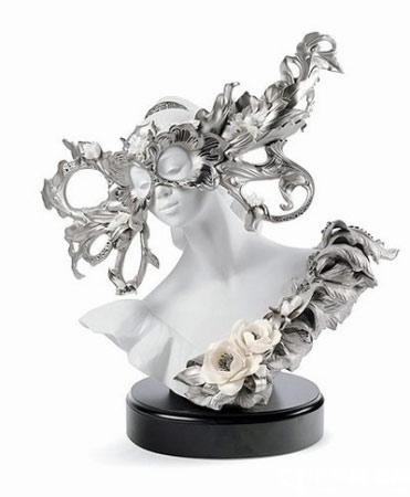 一個(gè)美麗的少女用威尼斯面具遮掩住自己的面龐,而面具上點(diǎn)綴著美麗的陶瓷花朵與頗具當(dāng)代設(shè)計(jì)風(fēng)格的紋理圖案。少女輕閉雙眼,陶醉在這場夢幻嘉年華中。少女臉上的面具柔美而精致,似乎在空氣中無邊地蔓延著,如夢如幻,是這件作品中的一大亮點(diǎn)。