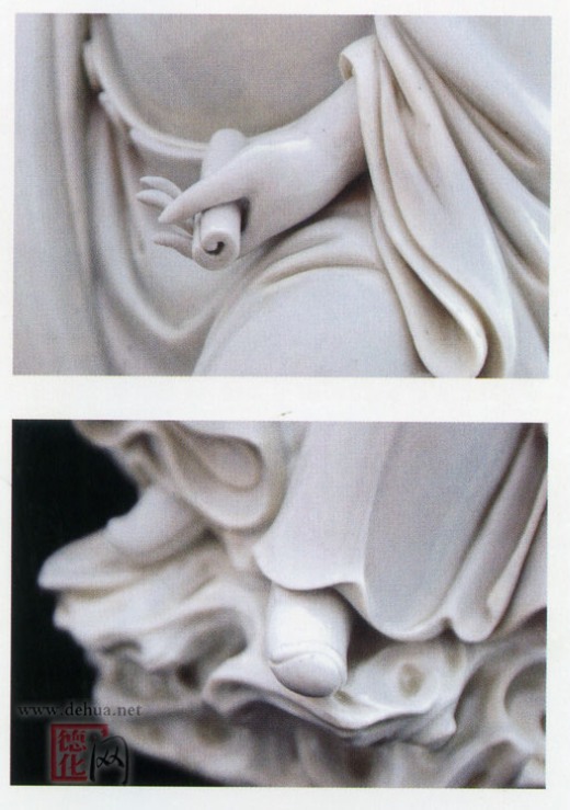 在中國歷史上占據(jù)重要地位的明代工藝百科全書《天工開物》是這樣介紹德化瓷的:“凡白土日堊土,為陶家精美器用。中國出惟五六處,北則真定定州、平?jīng)鋈A亭、太原平定、開封禹州,南則泉郡德化(土出永定,窯在德化)……德化窯惟以燒造瓷仙、精巧人物、玩器,不適實(shí)用”。這個觀點(diǎn)在農(nóng)本思想為主導(dǎo)的明代社會是合理的,但從我國的陶藝雕塑發(fā)展史來看,正是德化窯的瓷塑挽救了陶藝雕塑的頹勢。在宋代之前,氣勢恢宏的秦代兵馬俑、雍容華貴的唐三彩都是令世界贊嘆的上乘陶藝雕塑品,但自宋代起,陶塑慢慢開始沒落,直到德化瓷塑橫空出世,以瓷的質(zhì)感為底蘊(yùn),塑造了一批批活靈活現(xiàn)的神仙形象,終于撐起了明清陶瓷雕塑,成為一個時代的陶塑代表。何朝宗、張壽山、林朝景、陳偉、林希宗、林孝宗等瓷塑藝術(shù)大師運(yùn)用純樸的藝術(shù)語言和獨(dú)到的審美意識,通過“瓷雕”技法將傳說中的神仙人物和反映現(xiàn)實(shí)生活的人物故事一一重現(xiàn)。這些瓷塑雖形態(tài)各異,卻都傳神寫意,既豐富了人的感官享受,也為世俗化的生活領(lǐng)域開辟了一片清新雋永的天地。尤其是被譽(yù)為“瓷圣”的何朝宗,其不斷推陳出新的表現(xiàn)手法和精妙的衣紋神韻刻畫可謂“前無古人,后難來者”?梢哉f,德化瓷雕的藝術(shù)成就,在我國乃至世界的雕塑史上,都可稱之為永不凋零的藝術(shù)奇葩。