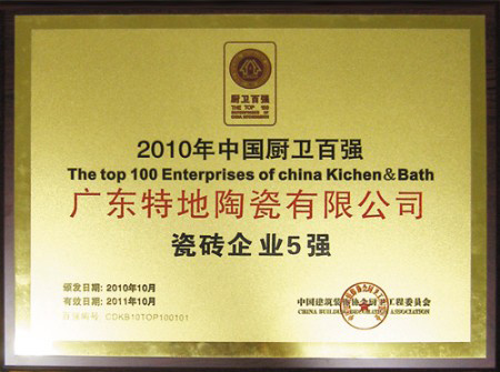 2010年10月,"中國廚衛(wèi)百強"評選結果出爐,特地陶瓷榮獲“瓷磚企業(yè)五強”榮譽稱號;同一周,中國陶瓷工業(yè)協(xié)會與陶瓷媒體向特地陶瓷頒發(fā)了“優(yōu)秀企業(yè)文化建設單位”獎。特地陶瓷近年來在品牌建設方面成績突出,其中企業(yè)文化建設的成效更是獲得業(yè)界一致肯定!