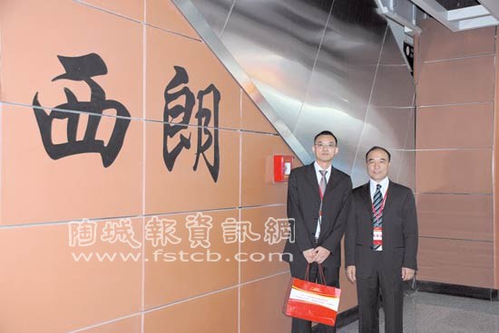 歐神諾陶瓷股份有限公司總經(jīng)理黃建起與工程銷售總經(jīng)理譚宜頌在開通首日試乘體驗(yàn)地鐵至西朗站于晶立方前合影
