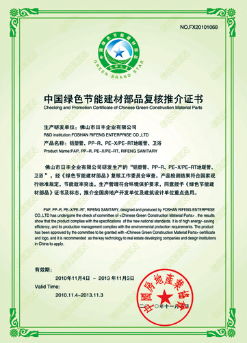 近期,在由中國房地產(chǎn)協(xié)會舉辦的“中國綠色節(jié)能建材部品”推介活動中,佛山市日豐企業(yè)有限公司生產(chǎn)的“鋁塑管、PP-R管、PE-X/PE-RT地暖管及衛(wèi)浴”等系列產(chǎn)品順利通過專家組評審,成為管道衛(wèi)浴行業(yè)唯一榮獲“中國綠色節(jié)能建材部品”稱號的企業(yè)。