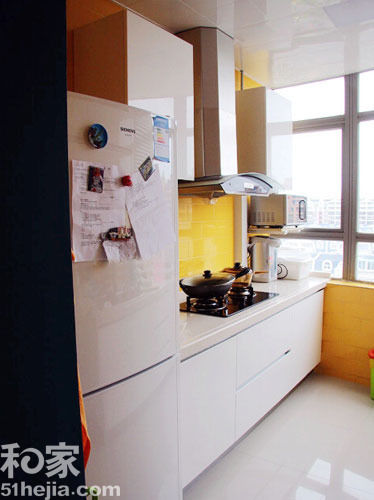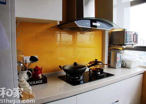這個廚房來自一個混搭北歐風的靚麗小家,到了廚房空間也延續(xù)了整個家靚麗簡約的風格;白色的簡約櫥柜但看算不上特別靚麗,但整體的廚房空間采用了橙黃色的瓷磚打造出一種活力的感覺,白色的簡約風格櫥柜在這空間中也更添時尚靚麗的感覺了。