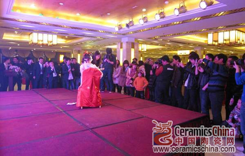 跨進宴會廳的大門,金絲玉瑪陶瓷獨具特色的藝術(shù)產(chǎn)品在華燈的照射下顯得更加璀璨奪目、光艷亮麗,設(shè)計師們在悅耳輕快的爵士音樂伴奏下輕松愜意地享受著這出精彩的產(chǎn)品盛宴。筆者在參觀產(chǎn)品的過程中采訪了幾名設(shè)計師,其中有一名設(shè)計師指著K金玉石系列產(chǎn)品講道:“像金絲玉瑪這樣花色豐富、紋路清晰可見、晶瑩剔透的產(chǎn)品是我前所未見的,用在酒店等高檔場所簡直比真石材更優(yōu)百倍”,緊跟其后的另一名設(shè)計師接過話頭說:“金絲玉瑪產(chǎn)品配套極為豐富,這是我們泰州市場上沒有任何一家同類產(chǎn)品能做到的,以后用這些豐富的產(chǎn)品作為設(shè)計元素肯定能為我們的創(chuàng)作注入新的靈感”,其他設(shè)計師也紛紛在抽獎劵上寫下自己最喜愛的金絲玉瑪產(chǎn)品型號及理由。晚宴中,中國傳統(tǒng)的變臉?biāo)囆g(shù)、神奇的魔術(shù)表演、現(xiàn)代味十足的人體彩繪等節(jié)目為現(xiàn)場嘉賓帶來了與眾不同的視覺享受,給參會的嘉賓們留下了一個難忘的夜晚。
