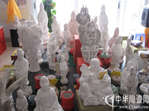 最近,德化興起了多位專項(xiàng)收藏愛好者。我們聞?dòng)嵹s到鄭先生的住所,一走進(jìn)客廳,只見整齊有序地?cái)[列著各式各樣的瓷塑觀音,五彩繽紛、千姿百態(tài),不禁令人眼前一亮。