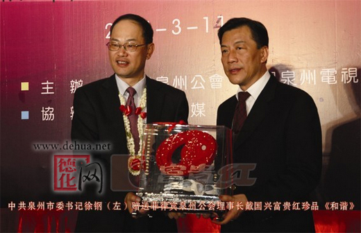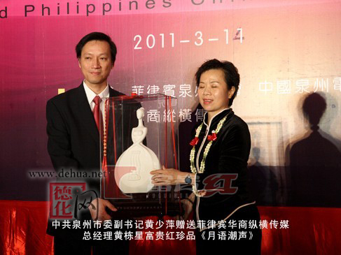 活動中,徐鋼書記作了熱情洋溢的致辭,他表示泉州與菲律賓交往源遠流長,此次開展的“中國·泉州文化周”活動,也是希望以文化為紐帶,增進泉州與菲律賓僑親的交流。同時,徐鋼書記還向華商縱橫傳媒總經(jīng)理黃棟星,泉州公會理事長戴國興等菲律賓商界、政壇精英人士贈送了來自福建省富貴紅文化發(fā)展有限公司的“富貴紅”陶瓷工藝品《月語潮聲》、《和諧》。
