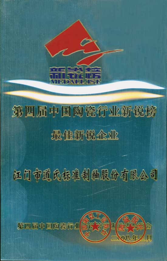 2008年3月28日,第四屆中國陶瓷行業(yè)新銳榜頒獎現(xiàn)場。當(dāng)主持人用激情昂揚(yáng)的聲音宣布“年度最佳新銳企業(yè)”的獲獎企業(yè)時,全場開始了一霎那的肅靜,———眾所周知,一年一度的新銳榜頒獎典禮,已成為行業(yè)的一大盛典,而“年度最佳新銳企業(yè)”,又是新銳榜分量極重的一個獎項(xiàng)———有著行業(yè)奧斯卡的美譽(yù)的新銳榜,首次將一個沉甸甸的大獎頒給一家色釉料企業(yè)———江門市道氏標(biāo)準(zhǔn)制釉股份有限公司。