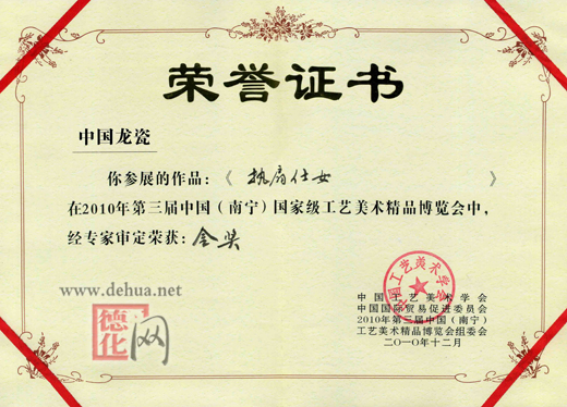 日前,中國龍瓷公司的《執(zhí)扇仕女》在2010年第三屆中國(南寧)國家級工藝美術(shù)精品博覽會中經(jīng)專家審定榮獲金獎。