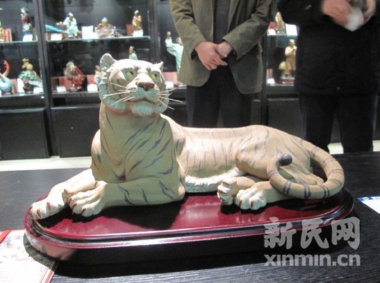 記者在現(xiàn)場看到,展覽第一天,不時有市民前來觀看。記者在現(xiàn)場看到,此次展覽共有280余件工藝品,最引人關注的是一只瓷器老虎,老虎趴在地上,回望上空。記者發(fā)現(xiàn),售價最貴的是一只瓷器瓶子,售價為58萬。