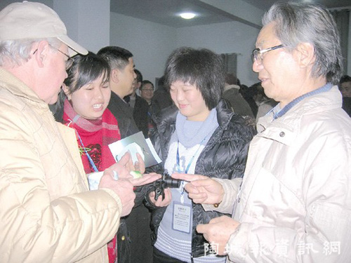周國楨教授(右一)在向中外陶藝家介紹手捏安仁“米塑”作品
