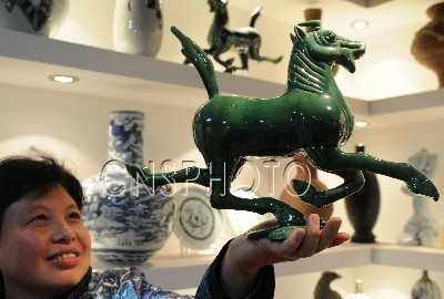圖為工作人員展示陶瓷雕塑馬踏飛燕。歷時一年,由山東省陶瓷藝術(shù)大師、淄博市的牛繼偉利用陶瓷創(chuàng)作的中國旅游標志“馬踏飛燕”4月中旬燒制成功。馬踏飛燕是1969年在甘肅省武威市出土的東漢時期的青銅器,高34.5厘米、長45厘米、寬13厘米,1983年10月被國家旅游局確定為中國國家旅游標志。