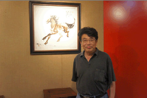 中國(guó)工藝美術(shù)大師馮杰和其作品《馬到成功》合影