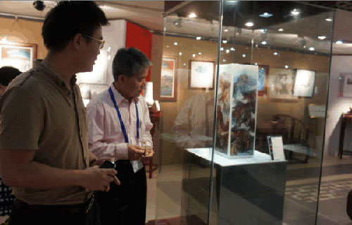 藏樂閣總經(jīng)理彭鵬(左)同廣東省工藝美術(shù)大師聯(lián)誼會(huì)會(huì)長(zhǎng)張春雷在欣賞李林紅教授的作品《四面鑲器》