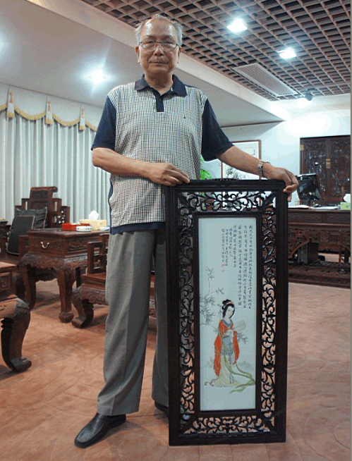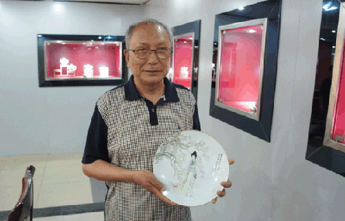 中國(guó)工藝美術(shù)大師王隆夫和其作品《瀟湘妃子》合影